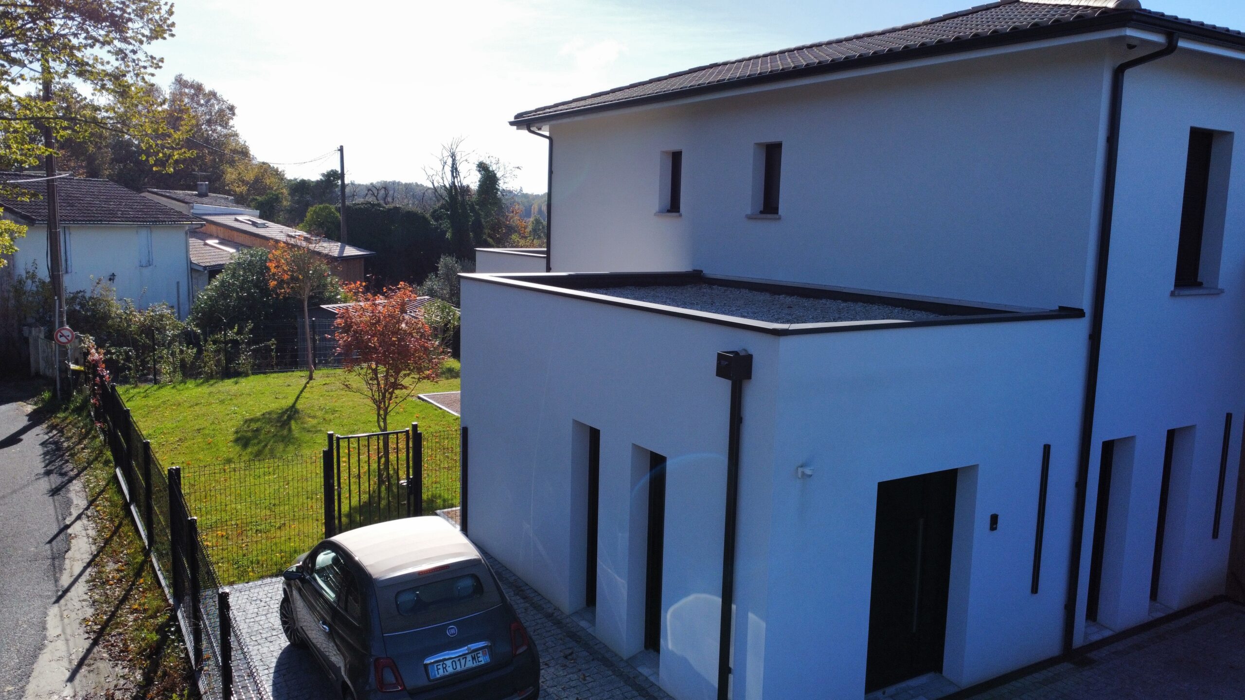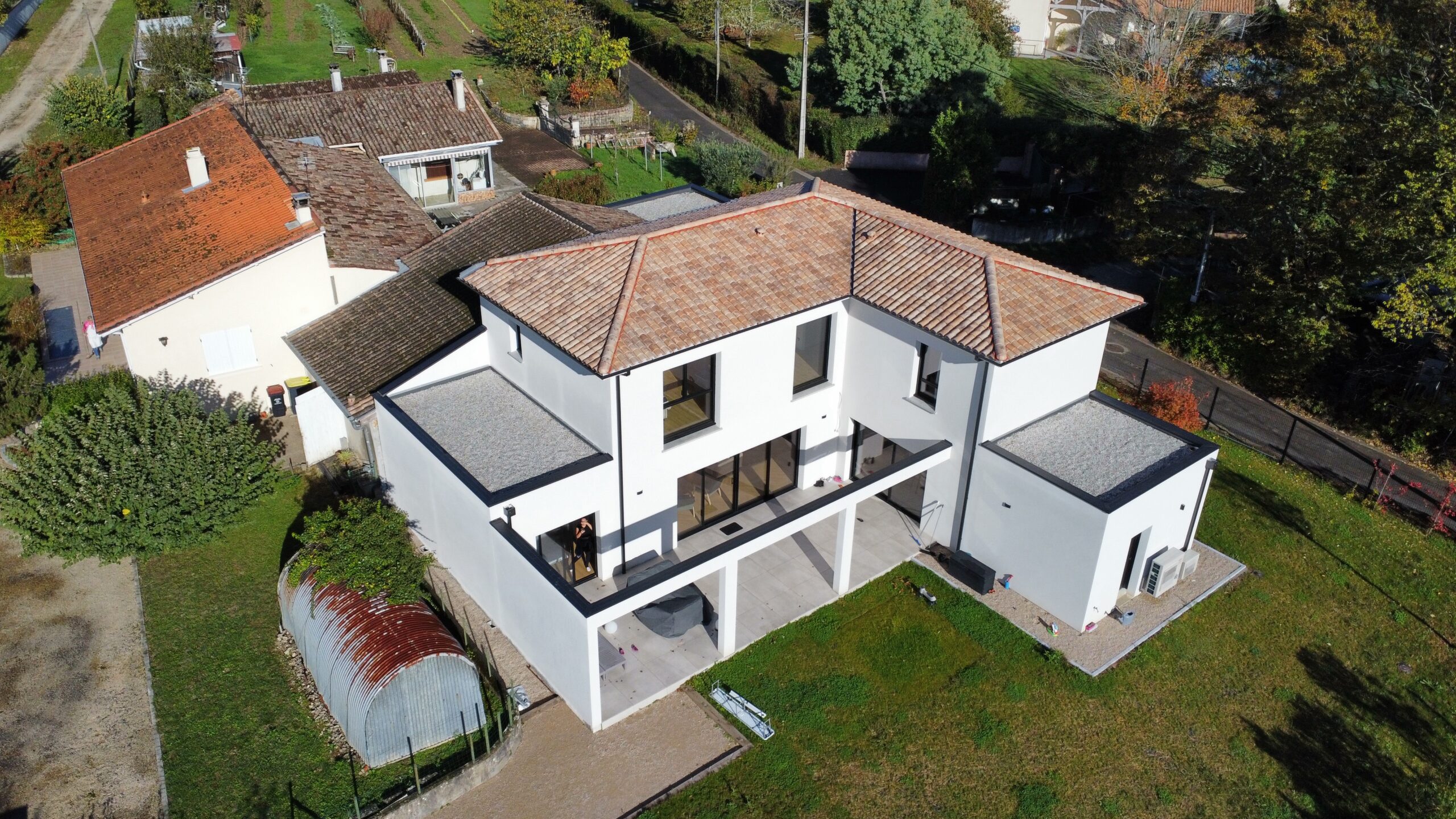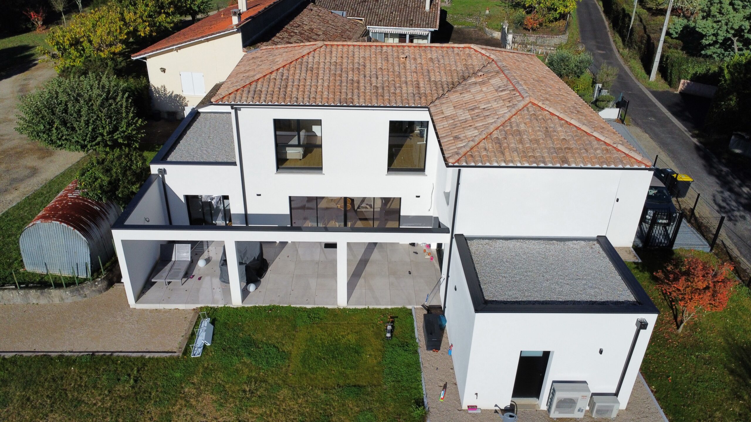 Avec un mélange de style : un toit plat sur l’entrée et une charpente traditionnelle à l’étage